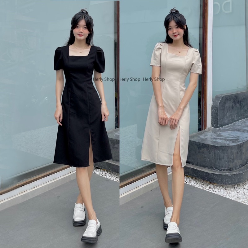 ĐẦM MIDI CỔ BẺ XẾP LY EO