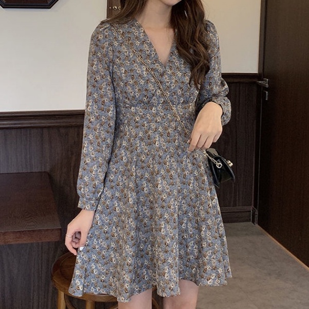 Đầm Midi Tay Dài Cổ Chữ v In Họa Tiết Hoa Nhí Xinh Xắn Thời Trang Kiểu Pháp Cổ Điển Cho Nữ 2022