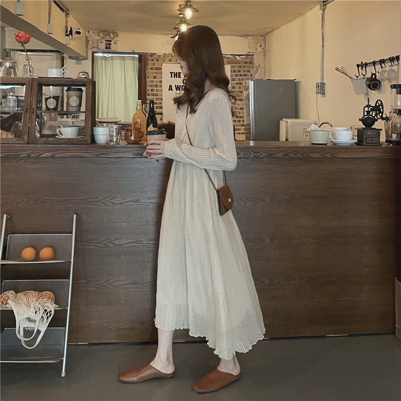 Đầm midi dài tay cổ chữ v xếp ly lưng thun co giãn tốt 46440