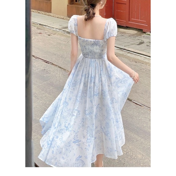 Đầm MIDI voan hoa cổ vuông mocking lưng phong cách retro