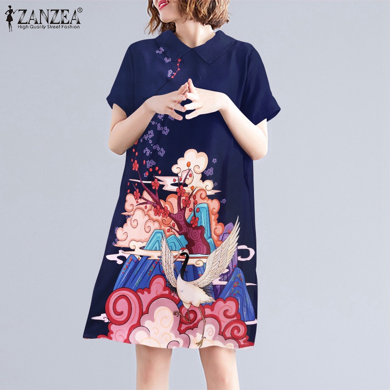 Đầm midi Zanzea tay ngắn có nút cài in họa tiết phong cách vintage thời trang dành cho nữ