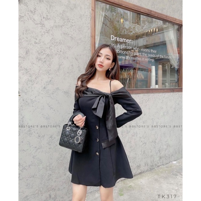 Đầm nữ đầm dự tiệc lệch vai 2 dây dáng xoè nơ ngực tiểu thư 2 lớp sang chảnh