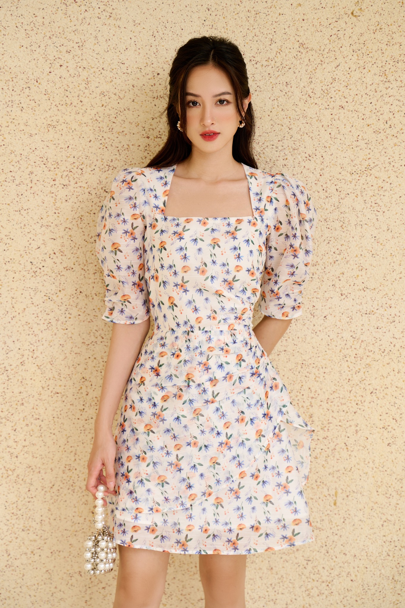 Đầm nữ cổ chữ V họa tiết dập nổi thanh lịch ngọt ngào nữ tính