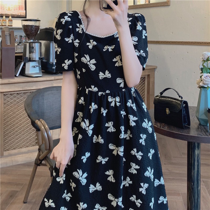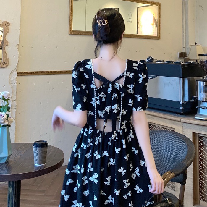 Đầm nữ ZHELIHANGFEI dài qua gối cổ vuông hở lưng cột nơ thời trang mùa hè retro