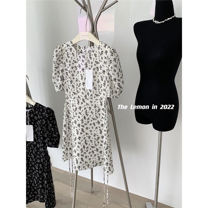 Đầm Tay Phồng Cổ Tròn Họa Tiết Hoa Màu Trắng Đen Thời Trang Mùa Hè Mới