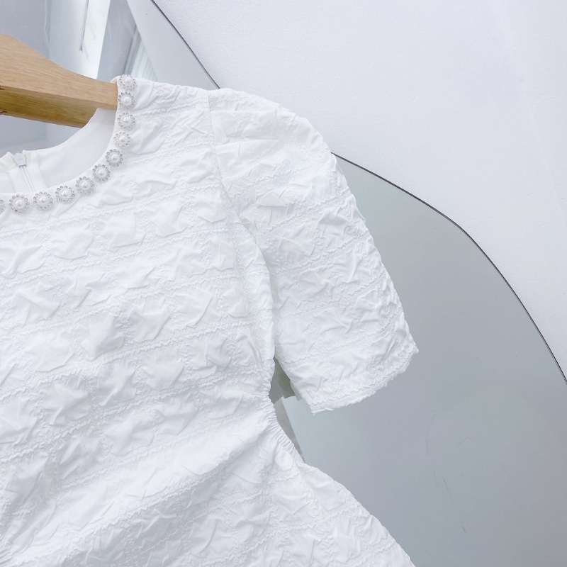 Đầm váy trắng cổ tròn đính đá khoét eo dự tiệc đi chơi dạo phố