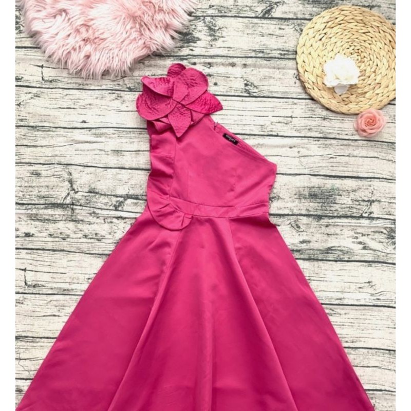 Đầm xòe cổ xéo vai đính hoa lớn trên vai đẳng cấp quý cô sang trọng quyến rũ
