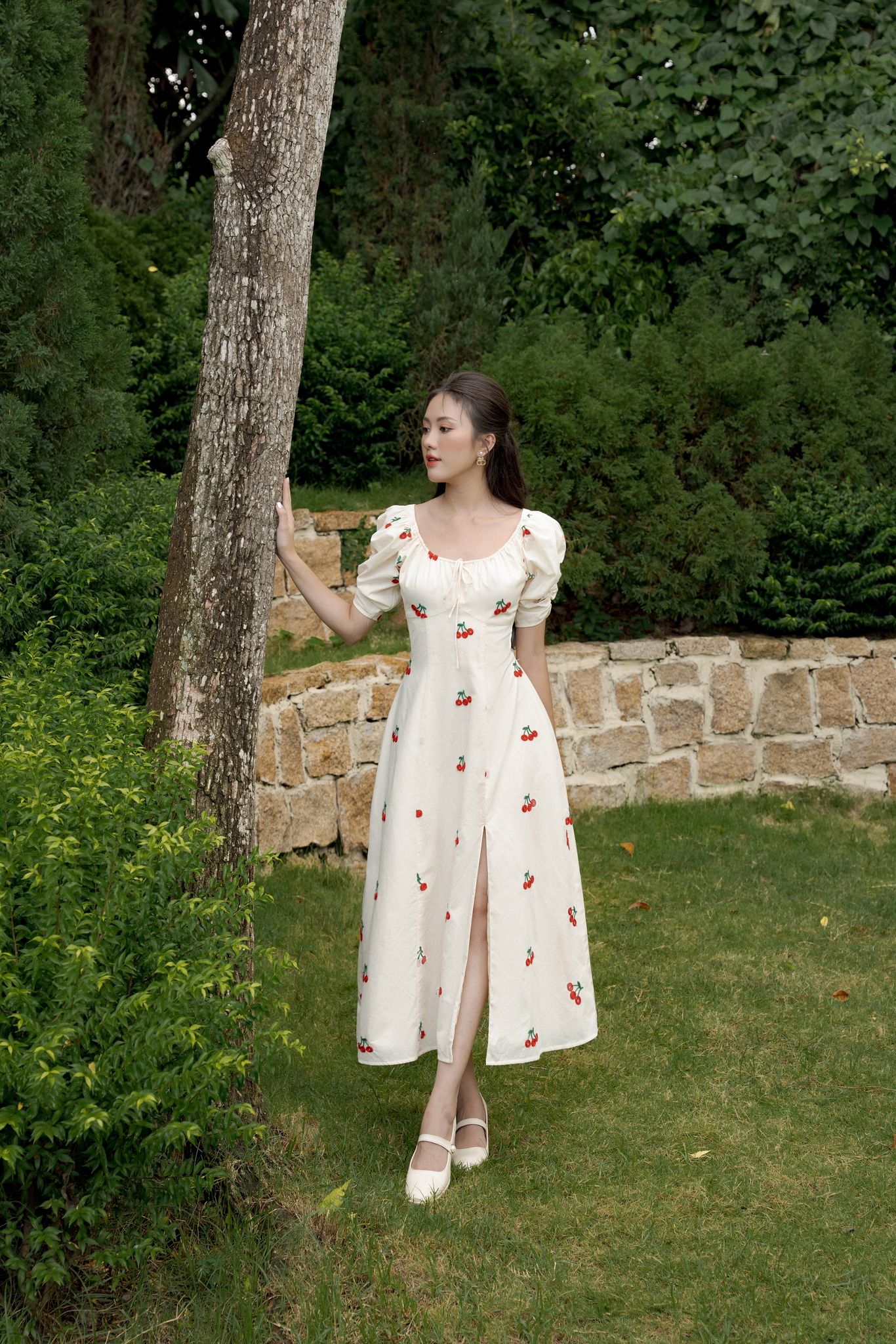 Váy nữ cổ vuông tay bồng dáng xoè tiểu thư, đầm nữ dáng dài dự tiệc thiết kế phối voan bèo 5837