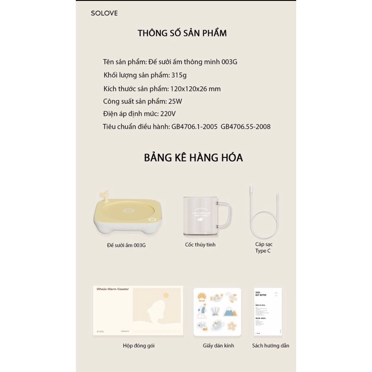 Tên sản phẩm : Đế hâm nóng đồ uống thông minh Thương hiệu : Solove Khối lượng sản phẩm: 315g Kích thước sản phẩm: 120x120x26mm Ưu điểm của Đế hâm nóng đồ uống 003G Solove: - Đế hâm sử dụng công nghệ dẫn nhiệt PTC, làm nóng nhanh, nhiệt tỏa đồng đều trên mặt đê. -Đặt cốc lên đế, đế làm nóng đồ uống chỉ trong vòng từ 3 - 5 phút - Nhiệt độ không đổi 52 độ, làm nóng vừa miệng, không gây bỏng. - Dùng được với nhiều loại cốc khác nhau : - Đệm Siicon có thể tháo rời, đễ dàng vệ sinh, không lo hư hỏng - Công suất tiêu thụ thấp chỉ 2,20W, an toàn, tiết kiệm điện. - Đế thiết kế tự tắt trong vòng 6 giờ, không lo cháy nổ hay để quên #dehamnongdouongthongminh#dehamnong#solove