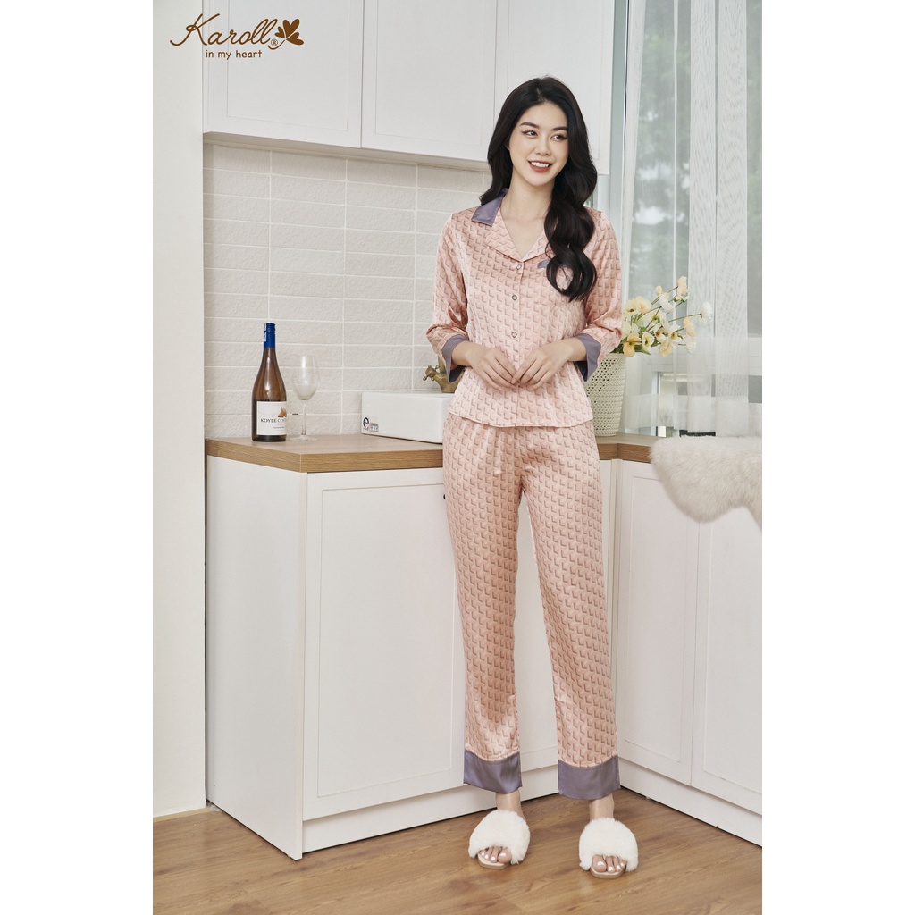 Đồ bộ mặc nhà nữ Karoll chất lụa quần dài tay lỡ hoạ tiết siêu xinh NH22.071
