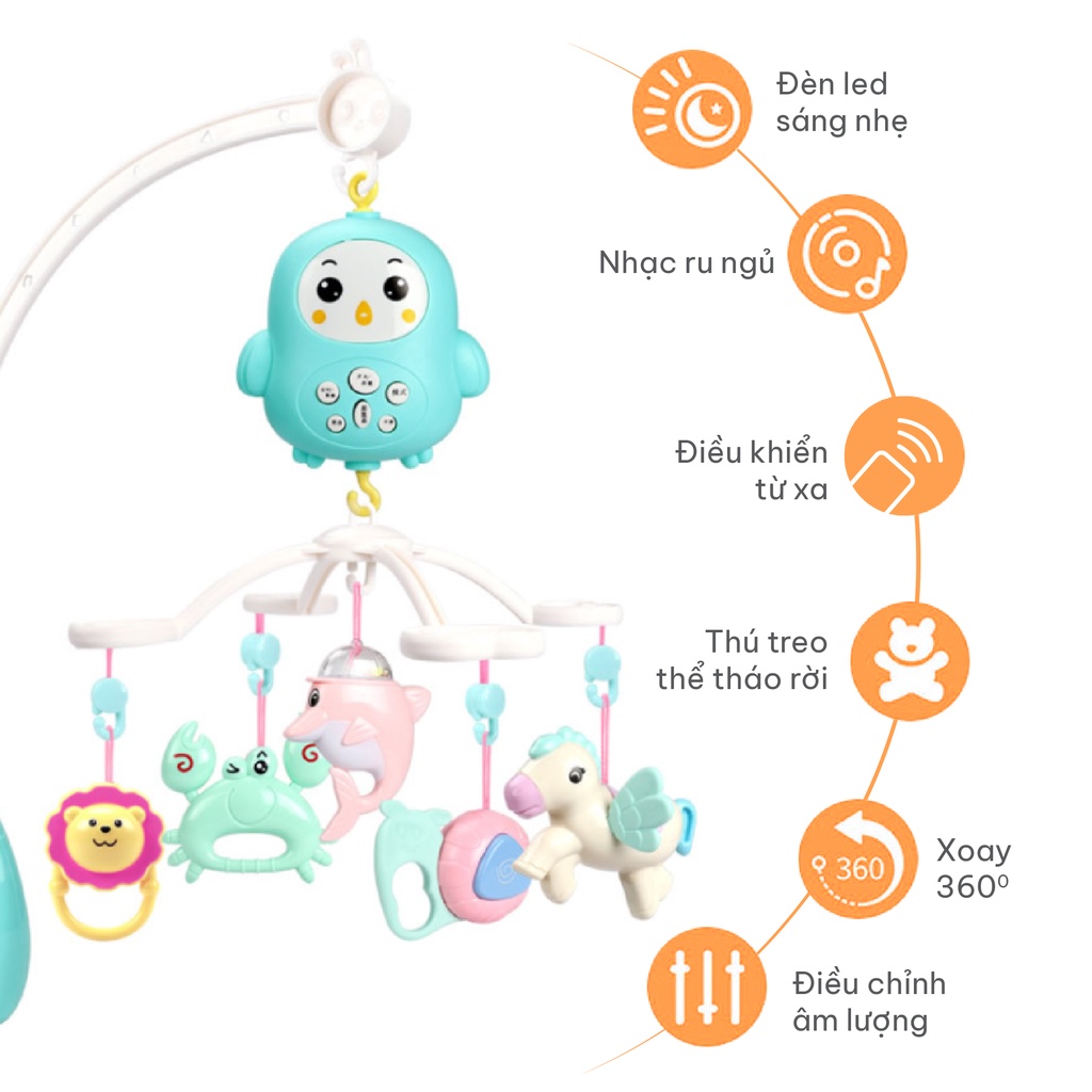 Đồ Chơi Treo Nôi Cũi Cho Bé Phát Nhạc Tự Xoay Giúp Trẻ Ngủ Ngon Có Điều Khiển Từ Xa Đèn Led Phát Sáng Nhựa ABS An Toàn