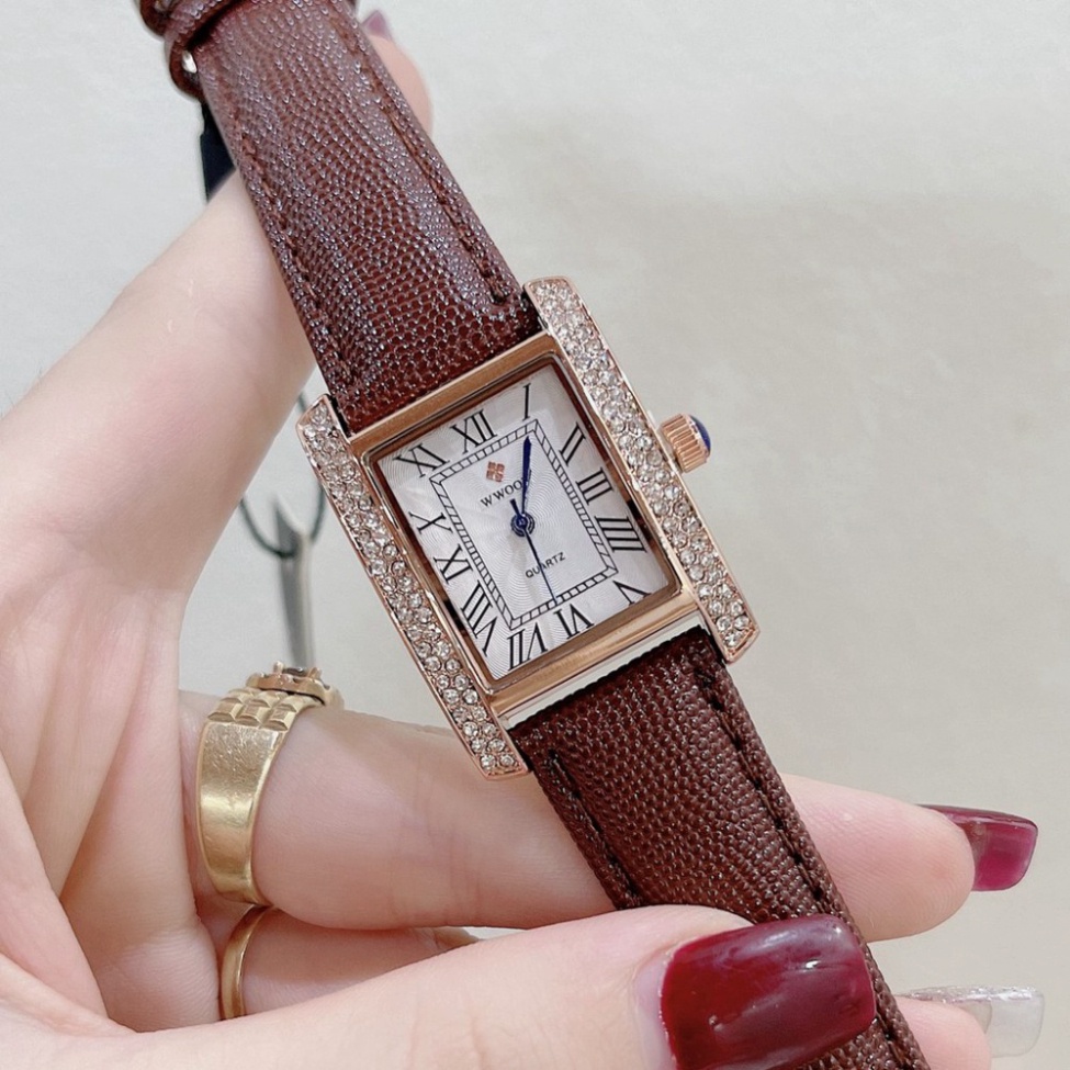 Đồng hồ dây da nữ Yuhae mặt hình khối vuông mini size nhỏ nhắn
