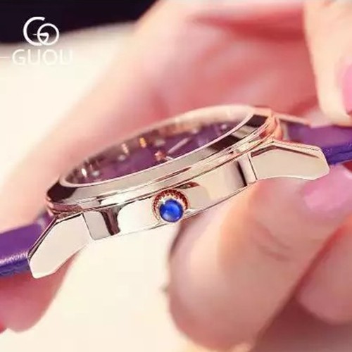 Đồng hồ nữ đeo tay dây da Guou viền mạ vàng chính hãng chống nước tuyệt đối 8086
