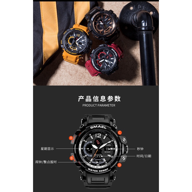 Đồng hồ nam điện tử Smael - đồng hồ thời trang 1702 chống thấm nước 5bar sang trọng 1. Thương hiệu: SMAEL 2. Hiển thị thời gian kép với chức năng đèn nền LED 3. Chống nước 30M, có thể bơi khi đeo. 4. Loại sản phẩm: Đồng hồ thể thao nam 5. Máy đồng hồ: Máy đồng hồ kỹ t