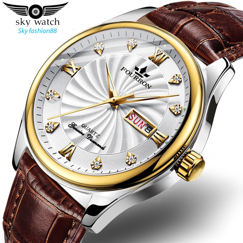 Đồng Hồ Nam FOURRON FN666F Mặt đính đá chạy 2 lịch Chống nước sinh hoạt tốt Mặt kính Mineral rất trong Dây Da pu