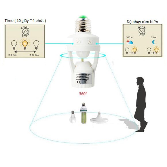 ĐUI ĐÈN CẢM ỨNG HỒNG NGOẠI GIỚI THIỆU - Đây là đui đèn cảm ứng hồng ngoại chuyển động, được lấy nguồn từ chính đui đèn bình thường có nối nguồn. Mắt cảm ứng đặt phía trên đui lắp bóng đèn, giúp tránh được những lúc bật và tắt không mong muốn. - Đui đèn cảm ứng hồng ngoại được cải tiến tách rời giữa mắt cảm ứng và đèn nhưng vẫn đảm bảo một khối thống nhất nhằm mang tới tiện nghi cho người sử dụng và đảm bảo an toàn cho mắt cảm biến cũng như tránh tình trạng nhiễu và bật tắc không mong muốn của cảm ứng. ỨNG DỤNG - Dùng để tắt mở đèn cho Nhà Vệ Sinh, Phòng Khách, Nhà Bếp, Nhà Kho, Showroom, Phòng Chờ, Garage, Hành Lang-Cầu Thang Khách Sạn hoặc nhà ở trước cổng…… LỢI ÍCH: - An toàn cho sức khỏe của người sử dụng vì không phải thường xuyên chạm vào công tắc điện, đặc biệt là công tác tại Nhà Vệ Sinh vì theo các nhà vệ sinh học công bố thì công tắc điện là nới chứa ổ vi trùng lây nhiểm bệnh truyền nhiễm. - An toàn cho trẻ em và người già khi đi vệ sinh phải mò công tắc để bật đèn cầu thang, nhà vệ sinh, tránh được các nguy cơ điện giật do rò rỉ điện hoặt tay ướt tiếp xúc với công tắc cơ truyền thống. - Tiết kiệm điện năng vì khi tránh được trường hợp quên tắt điện mỗi khi rời khỏi, đặc biệt gia đình có trẻ em. - Chống trộm khi lắp ở các vị trí cổng, ban công…vì khi đột nhập đèn sẽ bật sáng và kẻ trộm sẽ không dám vào nữa. Thông số kỹ thuật đui đèn cảm ứng hồng ngoại - Thời gian trễ tự tắt: 10 giây đến 5 phút - Độ cao lắp đặt: 2-3m - Góc quét: 110 độ - Bán kính cảm ứng: 2-3m - Điều kiện ánh sáng: Điều chỉnh ngày/đêm (10lux ~ 2000lux) - Công suất max: 60W - Cấp độ kín nước: IP20 (Chống bụi, lắp trong nhà) - Ứng dụng: Dùng cho nhà vệ sinh, cầu thang, hành lang, đèn cổng,... - Nguồn điện vào 110 ~ 220 VAC. - Tần số điện: 50/60Hz. Nút LUX :Điều chỉnh chế độ nhận biết môi trường sáng hay tối để kích hoạt chế độ cảm biến hồng ngoại: -Nếu người dùng cần điều chỉnh nút LUX xoay về phía “mặt trời “thì cảm biến sẽ luôn luôn được kích hoạt trạng thái sẵn sàng để nhận chuyển động thân nhiệt trong vùng quét để bật đèn nghĩa là sẽ cảm ứng cả ngày lần đêm. -Nếu người dùng cần điều chỉnh nút LUX xoay về phía “mặt trăng “thì cảm biến chỉ được kích hoạt trạng thái nhận chuyển động thân nhiệt trong vùng quét để bật đèn khi môi trường thiếu ánh sáng (tối), nghĩa là chỉ cảm ứng bật đèn trong môi trường tối (hoặc mờ tối tuỳ mức độ điều chỉnh nút Lux) - Khi thiết bị đã cảm biến bật đèn thì chế độ cảm biến sáng/tối không còn ảnh hưởng đến quá trình cảm biến thân nhiệt chuyển động trong chu kỳ đó Nút TIME :Điều chỉnh thời gian tự tắt,trong khoảng thời gian có thể chỉnh tự tắt từ 10 giây đến 5 phút.Thời gian trễ này sẽ được bắt đầu tính lại trong chu kỳ cảm ứng mới CHÚ Ý: Tắt nguồn điện trước khi lắp thiết bị Lắp đui đèn dạng xoắn E27 vào trần hoặc tường sau đó gắn thiết bị vào #duidentudong #duidencambie #duidenhongngoai #duoiden #duoidentudong #duoidencambien #duoidenhongngoai #dentudong #dencambien #duoidencamung #dencambien #dencamungcauthang #dencamunghongngoai