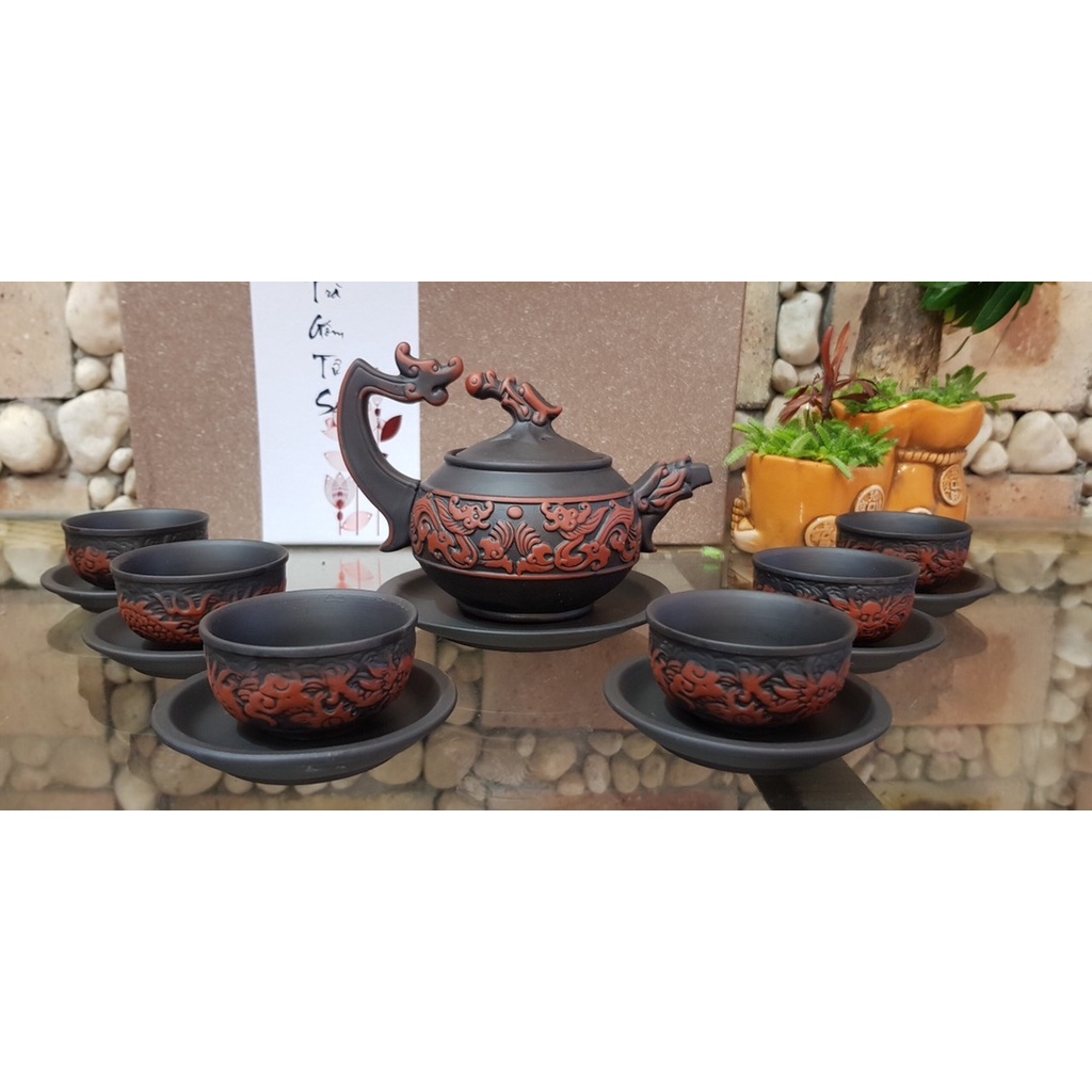 Bộ ấm chén gốm Bát tràng tử sa đất đen - Bộ đĩa tách ấm đắp nổi pha trà cao cấp