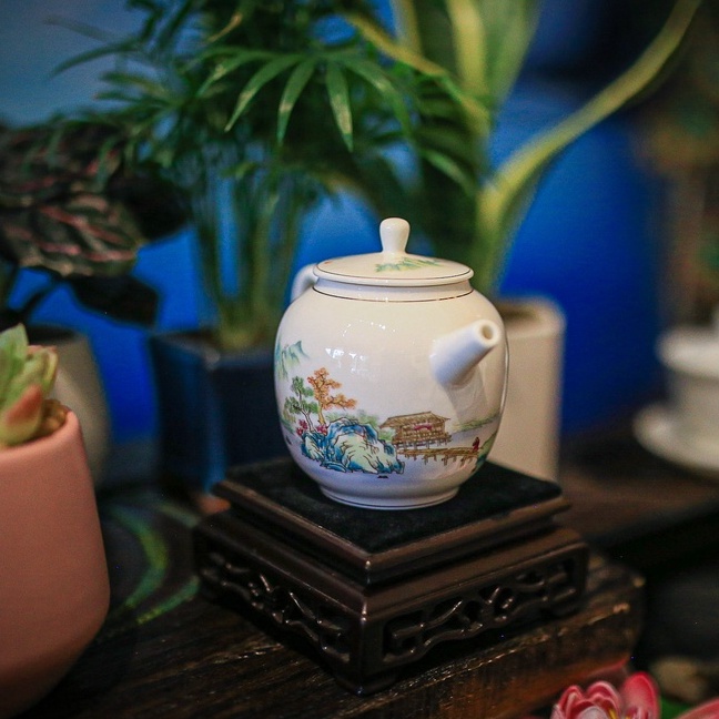 Ấm sứ pha trà hoạ tiết sơn thuỷ đồng quê, chất men ấm đẹp, dòng sứ Cảnh Đức. mã: TPC0021