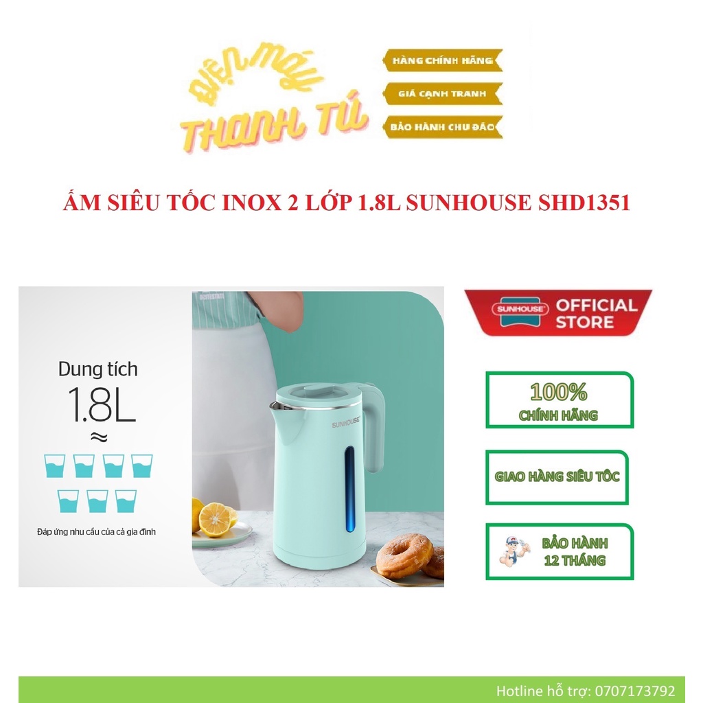 Ấm siêu tốc inox 2 lớp Sunhouse SHD1351, Dung tích 1.8 Lit, Bảo hành 12 tháng