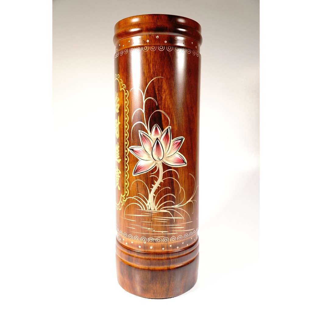 Ống cắm nhang hoa sen nổi cao cấp, có miếng mút lót chống trầy xước ở dưới đáy, hoa văn vẽ thủ công rất tinh tế và mềm mại, góp phần tô điểm vào vẻ đẹp của không gian thờ cúng Chất liệu: gỗ tự nhiên; Sản phẩm có nhiều kích thước; Phong cách: sơn mài nghệ thuật; Công d