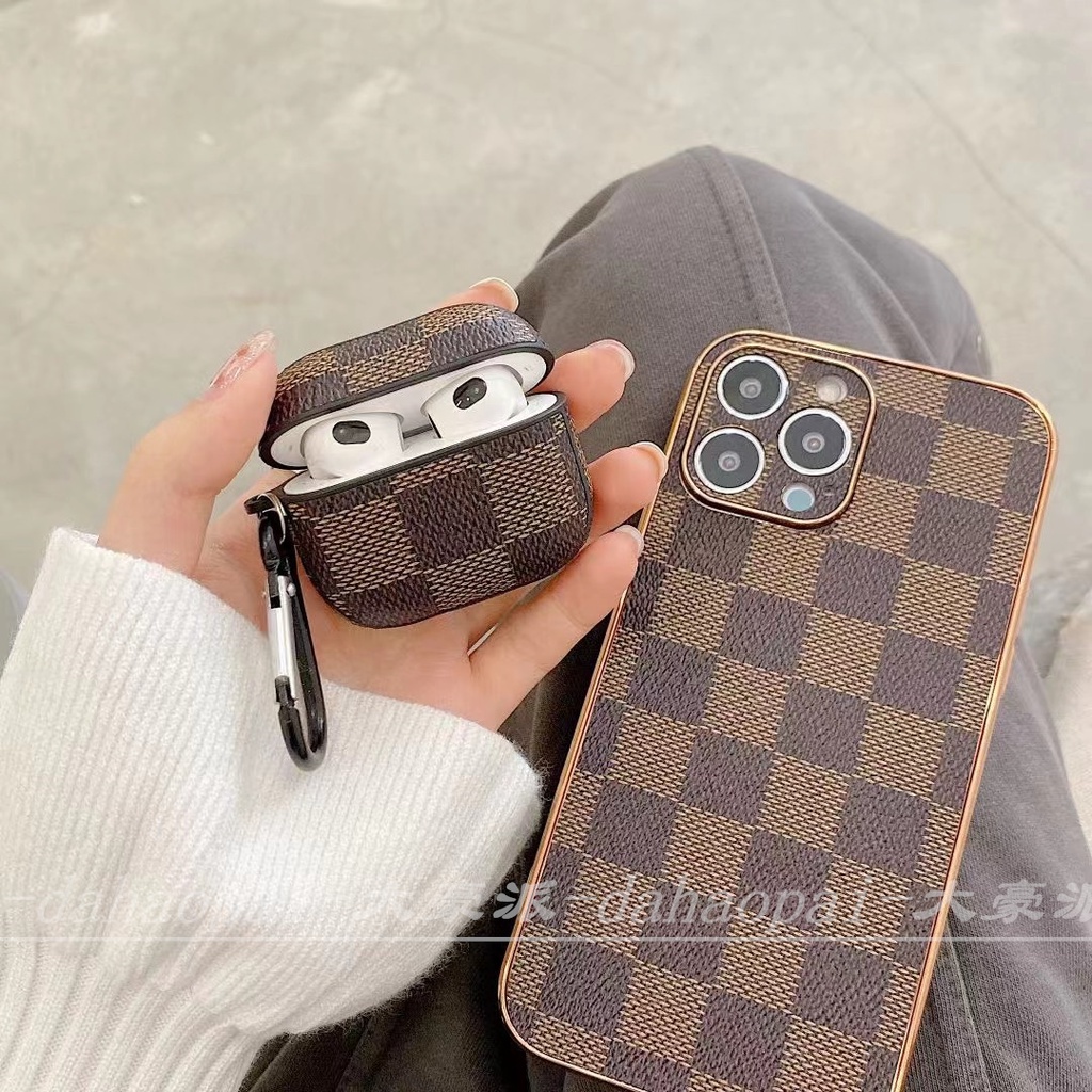 Ốp Điện Thoại Da Màu Nâu Kẻ Sọc Mạ Điện Có Ngăn Đựng Tai Nghe Cho iPhone 14 13 12 11 Pro max AirPods Pro 3 2