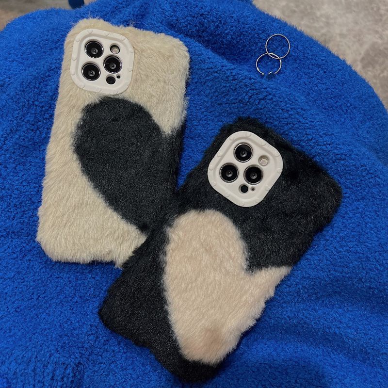 Ốp Điện Thoại Lông Nhung Họa Tiết Trái Tim Màu Trắng Đen Cho Iphone 11 12 13promax xr xs