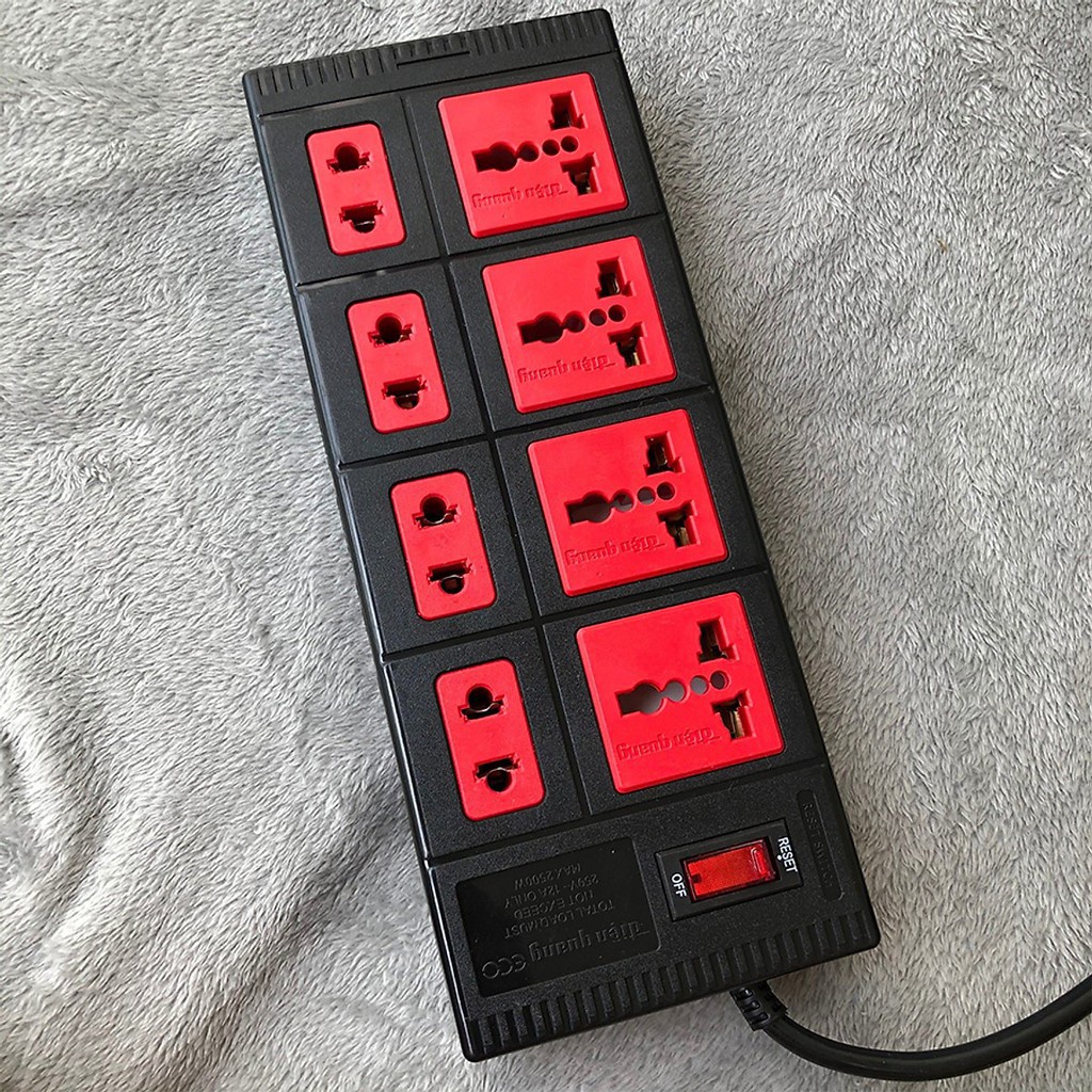 Ổ cắm Điện Quang chịu nhiệt dòng ECO - Hàng chính hãng - Công suất 2500W 1/ ĐIỂM ĐẶC BIỆT SẢN PHẨM: - Sử dụng nhựa ABS chịu nhiệt - Lỗ cắm làm bằng đồng nguyên chất - Công nghệ Extra Power tăng khả năng đàn hồi cho lỗ cắm, tương thích với mọi tiêu chuẩn phích cắm - Đèn hiển thị nguồn điện tại mọi lỗi cắm 2/ THÔNG SỐ KỸ THUẬT: * Thông số điện: - Điện áp: 250V - Cỡ dây: 0.75mm2 - Chiều dài dây điện (m): 2m - Công tắc nguồn: 1 công tắc - Mạch ngắt điện (breaker): Có - Số lỗ cắm: 8 ổ cắm/6 ổ cắm tùy chọn - Màu sắc: Đen đỏ hoặc trắng đỏ * Đóng gói: - Kích thước sản phẩm: 21 x 11.5 x 34mm - Trọng lượng tịnh: + Đối với dây 2m: 500g + Đối với dây 5m: 600g