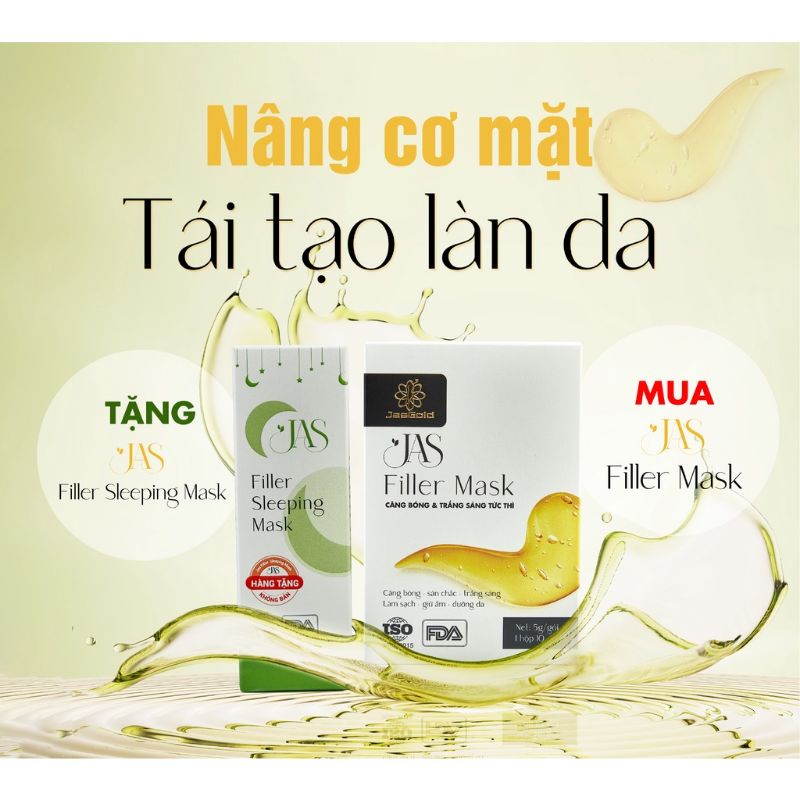 Mặt nạ JAS FILLER MASK 1 hộp 10 gói - CHÚ Ý: Điều đặc biệt hơn nữa khi mua 1 hộp mặt nạ filler Jas Filler Mask của thương hiệu Jasgold, các bạn sẽ được tặng kèm 1 hộp mặt nạ ngủ JAS FILLER SLEEPING MASK , bên trong hộp nạ ngủ chứa 5 gói. 1.Thông tin về sản phẩm mặt