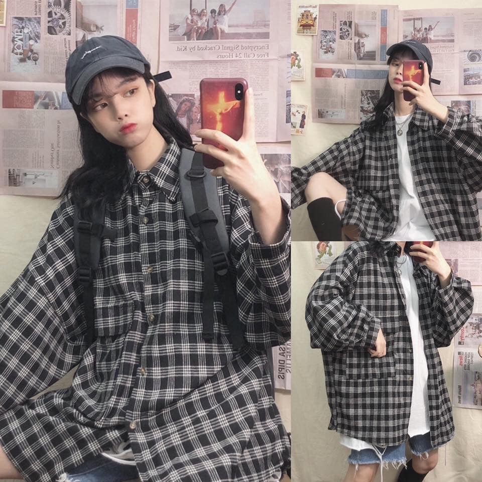 A011 Áo sơ mi kẻ caro oversize nam nữ vintage dài tay ulzzang, áo khoác chống nắng cỡ rộng tay phồng phong cách Hàn Quốc