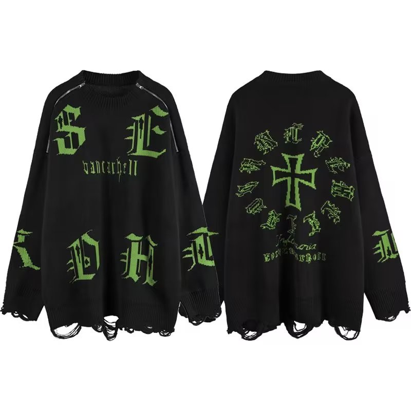 ✦ AFFLIGE ✦Áo Sweater Dệt Kim Cổ Tròn Dáng Rộng In Họa Tiết Đục Lỗ Thời Trang Thu Đông Cho Nam
