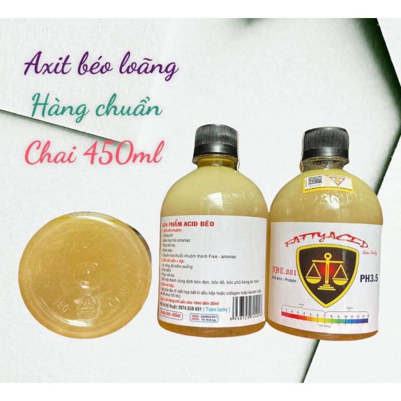 TÓC HÉO- HÃY DÙNG AXIT BÉO. Axit béo - giúp tăng cường độ bóng mượt cho mái tóc 💯Giảm mùi khó chịu của thuốc nhuộm. 💯Phục hồi tóc, chống xót, chuyển hóa thuốc nhuộm thành không có mùi khó chịu. Giúp cho việc nhuộm tóc, dưỡng tóc, uốn tóc, tẩy tóc, ...được hiệu quả hơn làm cho tóc sau khi dùng hóa chất :x: BỀN MÀU, BÓNG ĐẸP MÃI GIÚP CHO MÁI TÓC KHÔNG BỊ MẤT MÀU, PHAI MÀU. :x: GIÁ CỰC TỐT, 1 CHAI 450ML DÙNG CHO 25-30 ĐẦU Ạ ➡Tóc khỏe pha 5ml, tóc thường pha 20ml, tóc yếu pha 30ml ( áp dụng đối với uốn ép nhuộm) :arrow_right: Với phục hồi: trộn 30ml này với collagen hoặc keratin rồi hấp như bình thường zalo 0963178547