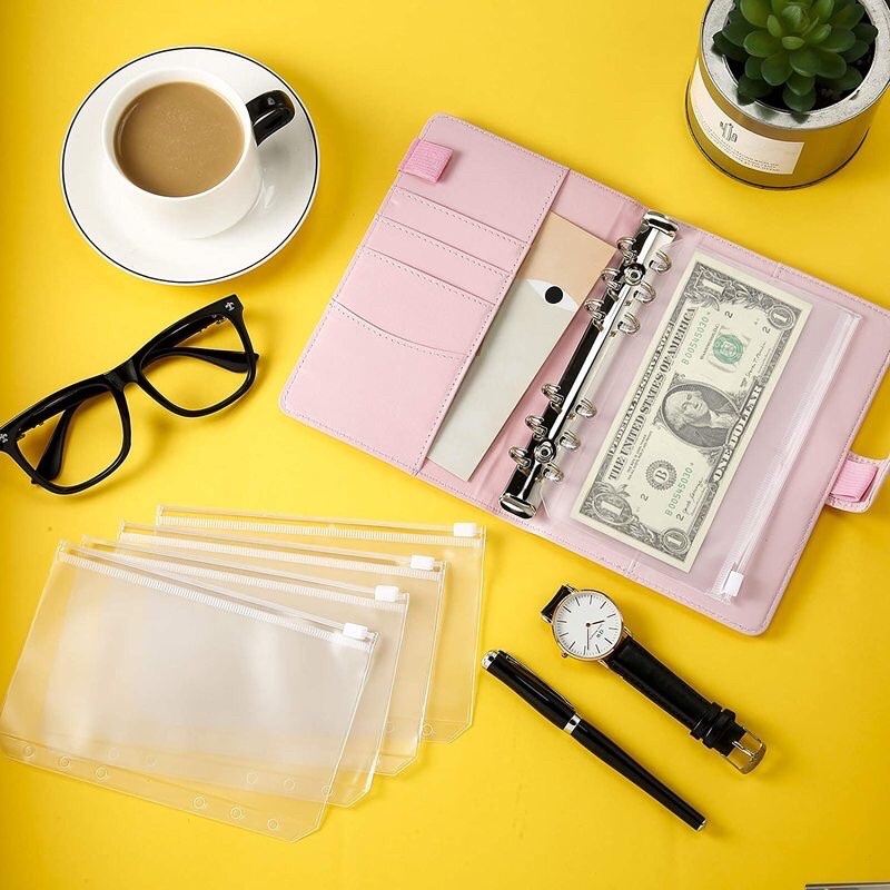 Sổ Tiết Kiệm Ghi Chú Chi Tiêu Thông Minh, Thiết Kế Còng 6 Lỗ Bìa Da Pu Kèm 12 Túi Zip A6