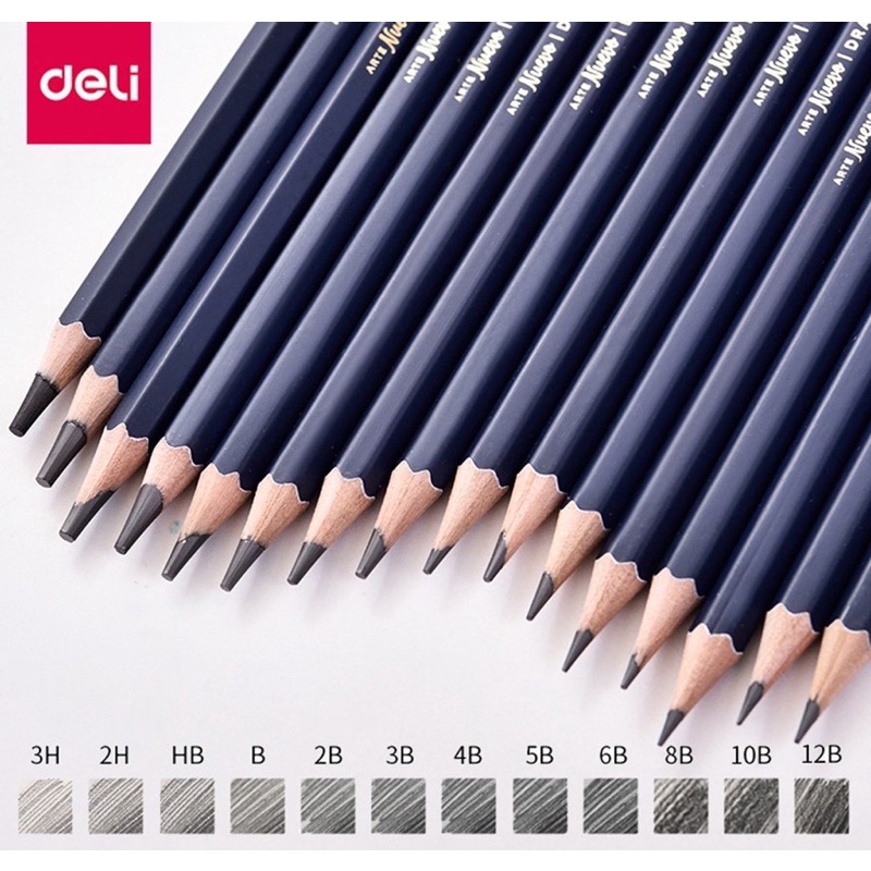 Dòng sản phẩm Bút chì cao cấp Deli Nuevo bao gồm 16 độ đậm/ nhạt khác nhau: B, 2B, 3B, 4B, 5B, 6B, 7B, 8B, 9B, 10B, 12B, 14B, H, 2H, 3H, HB mang lại sự tiện lợi khi sử dụng H là viết tắt của Hard( cứng), B viết tắt cho từ Black, còn F là Fine có thể gọt rất nhọn mà k