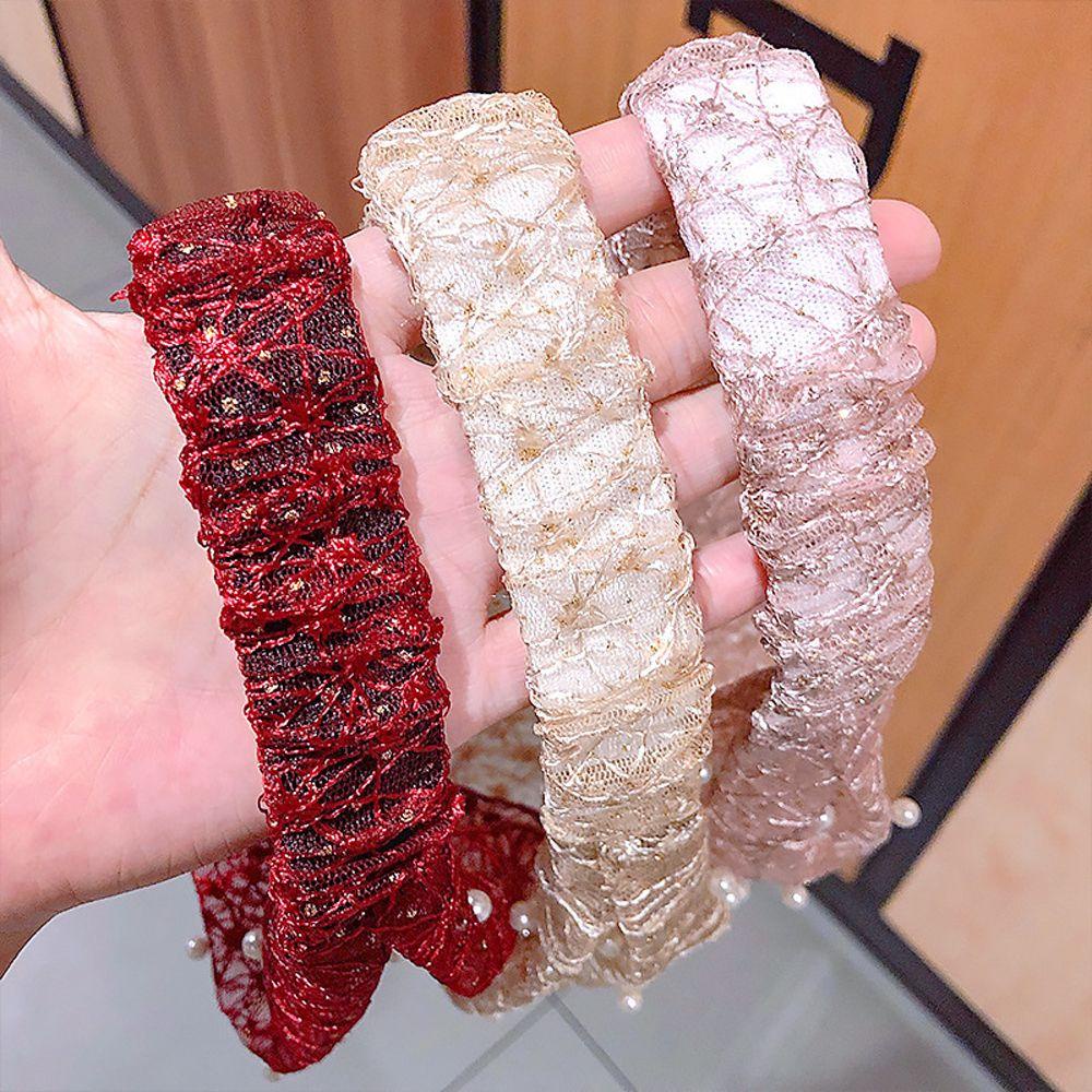 Băng Đô Cài Tóc Bản Rộng Phối Ren Hoa Đính Ngọc Trai Nhân Tạo Phong Cách Hàn Quốc Thanh Lịch Cho Nữ