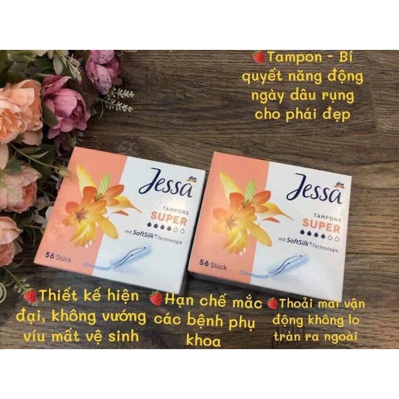 Tampon Jessa của Đức dành cho phụ nữ ngày đèn đỏ Chỉ 180 k hộp 80 tampon Những lý do chị em nên sử dụng tampon: Tampon là một loại “băng vệ sinh hiện đại”, có hình dạng ống tròn và có kích thước phù hợp để đưa vào bên trong “cô bé”. Khác với các loại băng vệ sinh kh
