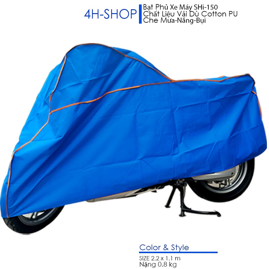 Bạt phủ xe máy SH-150 , chất liệu vải dù cotton phủ PU , dày chống nắng tốt, bụi bặm, dẻo dai, bảo vệ xe máy, sản phẩm có viền và túi đựng đẹp.4H Bạt trùm xe máy Bạt che xe máy Bạt phủ xe máy Mô tả sản phẩm Chất liệu vải dù cottn phủ tráng lớp PU giúp chống lại Chấ