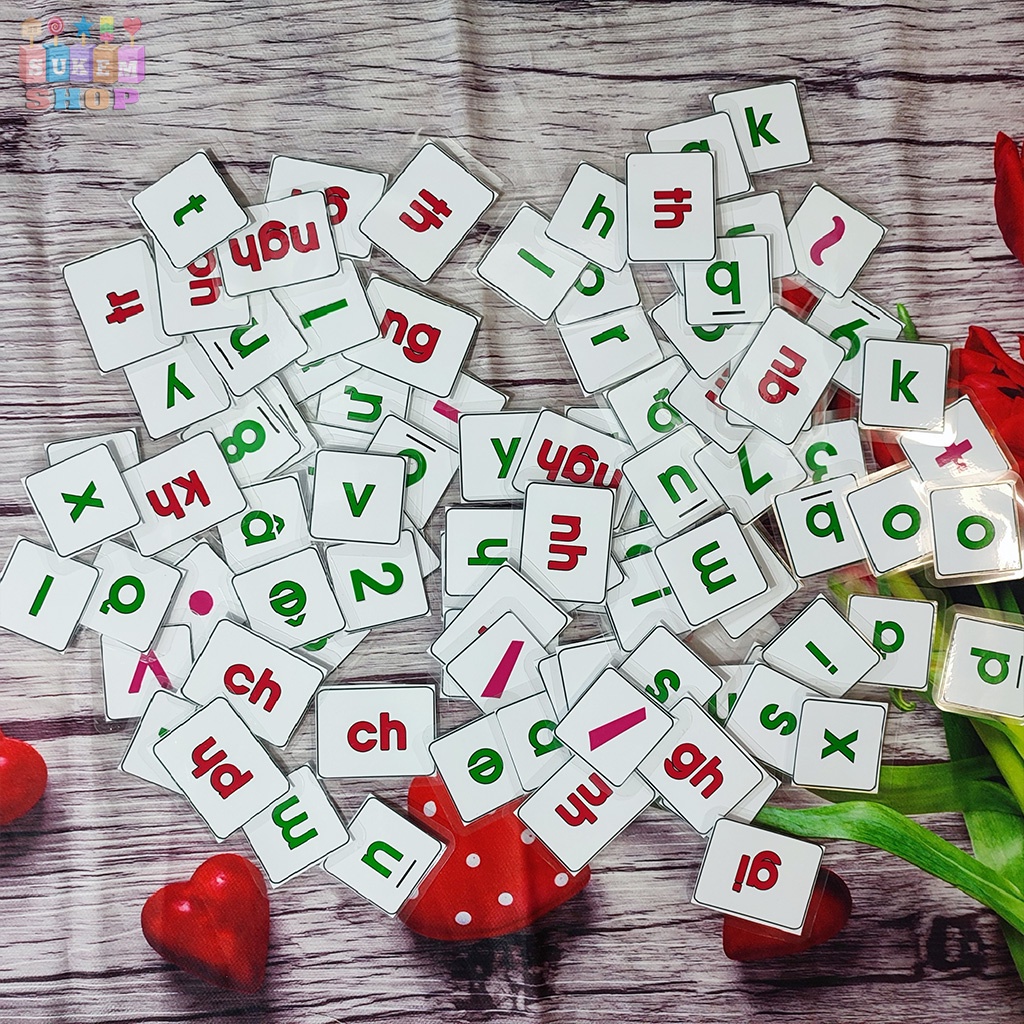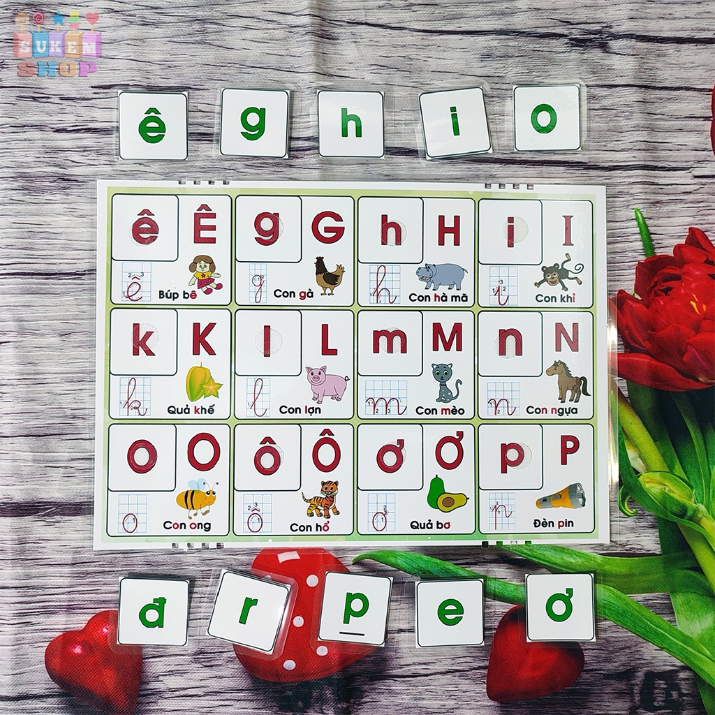 Bảng chữ cái tiếng Việt có núm cầm có in hình ở dưới, từ và hình ảnh minh hoa