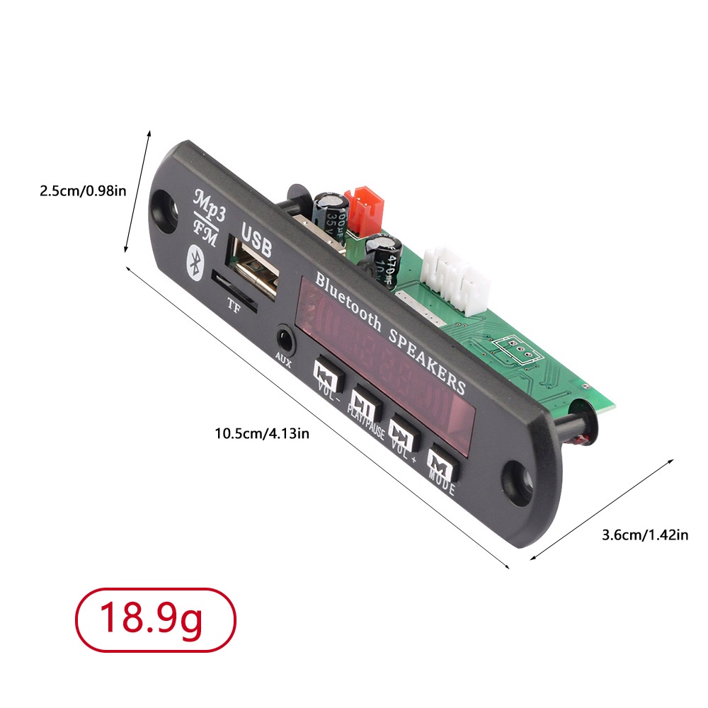 Thời gian giao hàng dự kiến cho sản phẩm này là từ 7-9 ngày Đặc điểm sản phẩm: 1. Giải mã kép hỗ trợ nhạc định dạng MP3, WMA, WAV, FLAC, APE không mất tín hiệu. 2. Hỗ trợ chức năng cuộc gọi bluetooth, phiên bản bluetooth 5.0. 3. Màn hình màu kỹ thuật số hiển thị. 4. Hỗ trợ MMC/ SD/ MMA và các thẻ khác, hỗ trợ giao diện USB (USB). 5. Chức năng bộ nhớ tắt nguồn. 6. Hỗ trợ hoạt động điều khiển từ xa hồng ngoại khoảng cách 10m. 7. Hỗ trợ đầu vào âm thanh bên ngoài trên dây. 8. Hỗ trợ radio FM, dải tần tìm kiếm (87.5MHZ-108.0MHZ). 9. Các nút: Điều khiển đa hướng bốn nút, VOL-/ AUTO/ VOL +/ MODE. Thông tin sản phẩm: Chi tiết hoạt động chính: 1. Nút VOL- (bài hát trước/ âm lượng giảm): ở trạng thái MP3, nhấn nhanh VOL- là bài hát trước đó, nhấn và giữ là giảm âm lượng; trong trạng thái FM, nhấn nhanh là tăng số đài; trong bluetooth, một lần nhấn nhanh là bài hát trước đó trên bluetooth và một lần nhấn và nhấn và giữ là giảm âm lượng. 2. Nút AUTO (phát/ tạm dừng): ở trạng thái MP3, nhấn nhanh AUTO để phát/ tạm dừng; ở trạng thái FM, nhấn nhanh để phát/ tạm dừng, nhấn nhanh để tự động đóng và lưu trạm; nhấn nhanh để phát trong bluetooth chức năng/ tạm dừng. 3. Nút VOL+ (bài hát tiếp theo/ âm lượng tăng): ở trạng thái MP3, nhấn nhanh VOL+ cho bài hát tiếp theo, nhấn và giữ để tăng âm lượng; ở trạng thái FM, nhấn nhanh để giảm số đài; trong Bluetooth chức năng nhấn nhanh cho bài hát bluetooth tiếp theo, nhấn và giữ để giảm âm lượng. 4. Nút MODE: chuyển đổi giữa USB/ TF/ FM/ đầu vào âm thanh/ chức năng bluetooth lần lượt. Mô tả chức năng ghi âm: 1. Nhấn và giữ nút MODE để bắt đầu ghi và nhấn và giữ nút MODE một lần nữa để hủy chức năng ghi âm. 2. Nhấn và giữ nút Play/ Pause để phát tệp ghi âm. 3. Khi ghi, cần kết nối thiết bị lưu trữ, chẳng hạn như: đĩa U hoặc thẻ TF. Lưu ý: Sản phẩm được vận chuyển từ xa mà không có pin. Mẫu pin là CR2025, quý khách cần chuẩn bị sẵn sàng Gói hàng bao gồm: Bảng mạch giải mã nguồn bluetooth * 1 Điều khiển từ xa * 1 Dây cáp * 3