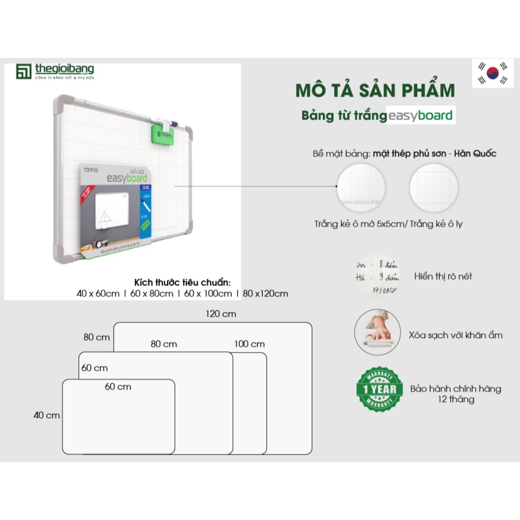 Bảng từ trắng viết bút lông 60 x 80cm Tân Hà, Mặt bảng từ Hàn Quốc chống lóa, có kẻ ô - tặng lau bảng + bút dạ bảng