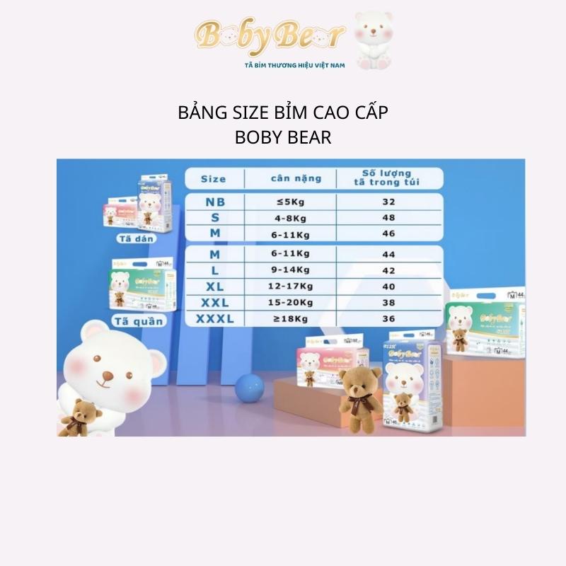 Bỉm BOBY BEAR đai đệm mây không lo hằn bụng, siêu hấp thụ, sức chứa 12 giờ NB32/S48/Md46/Mq44/L42/XL40/XXL38/XXXL36 (Size/số miếng) MÔ TẢ SẢN PHẨM BỈM BOBY BEAR: - Bỉm quần bỉm dãn BOBY BEAR được nghiên cứu và phát triển bởi đội ngũ chuyên gia người Việt sẽ mang tới