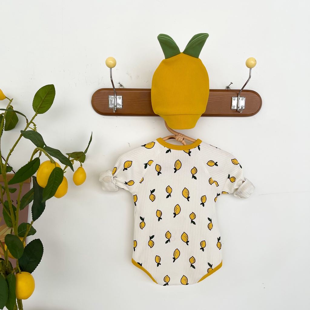 Bộ áo liền quần tay dài in họa tiết quả chanh + mũ xinh xắn dành cho trẻ sơ sinh từ 0-24 tháng tuổi
