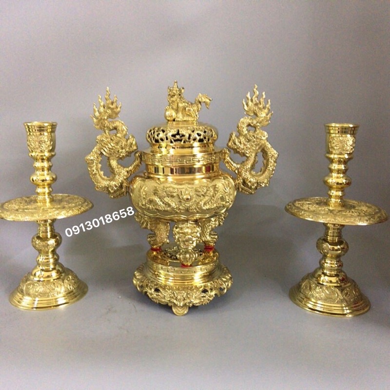 Bộ đỉnh lư thờ bằng đồng vàng cao cấp 34cm F34 tam sự ngũ sự đỉnh hạc nến bằng đồng Nguyên chất