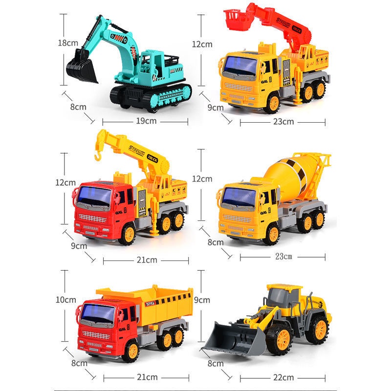 Đồ chơi xe tải xây dựng lớn cho bé, máy xúc, máy cẩu, xe trộn, xe cứu hỏa trẻ em 3 đến 6 tuổi Ô tô đồ chơi cho bé, mô hình oto xây dựng loại lớn chạy đà Thông tin chi tiết + Kích thước hộp màu 6 xe : 70x10x31 cm - Kích thước xe: 17x 8x 25 cm + Kích thước hộp bộ 6 xe