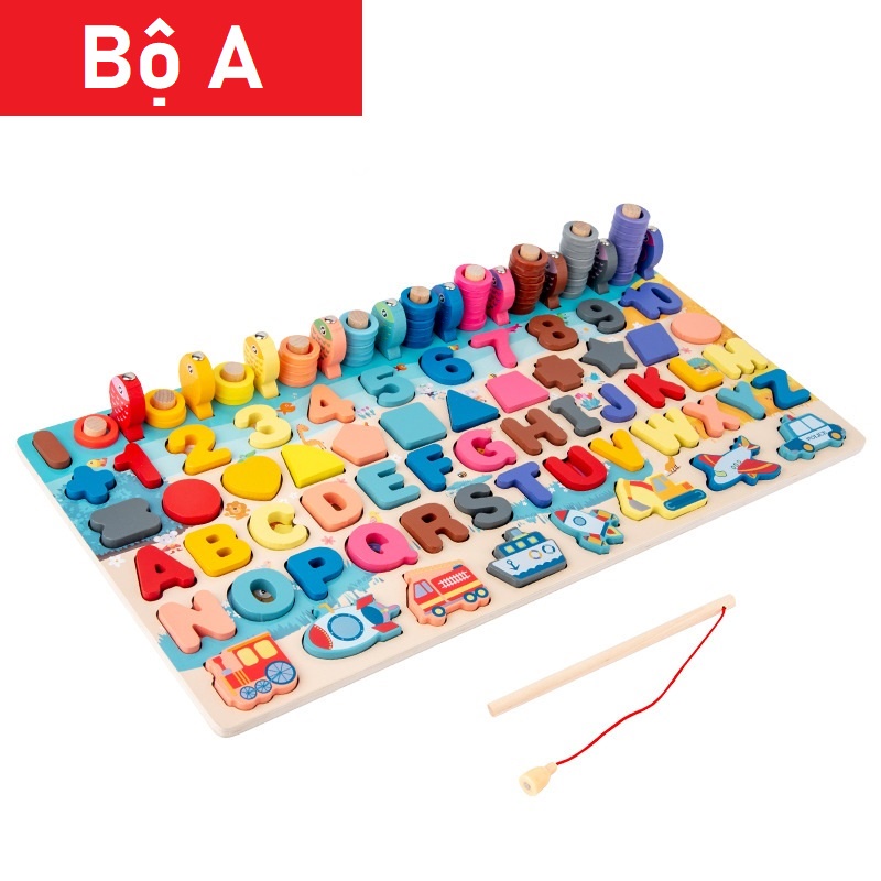 Bộ đồ chơi bảng gỗ 7in1 câu cá kèm số tư duy, chữ cái, trái cây, động vật cho bé