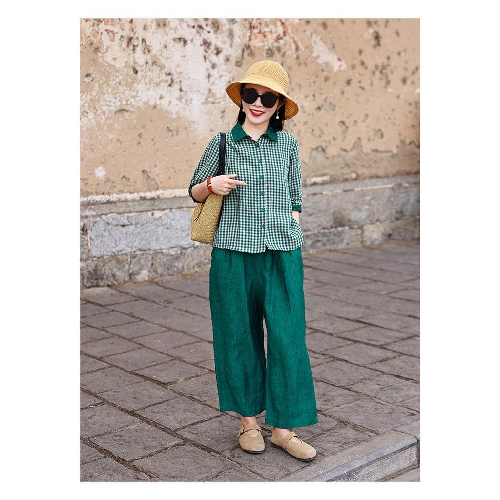 Bộ Đồ Nữ Linen Áo Sơ Mi Xanh Caro Có Cổ Kết Hợp Với Quần Ống Suông Dáng Dài Thoáng Mát Mùa Hè