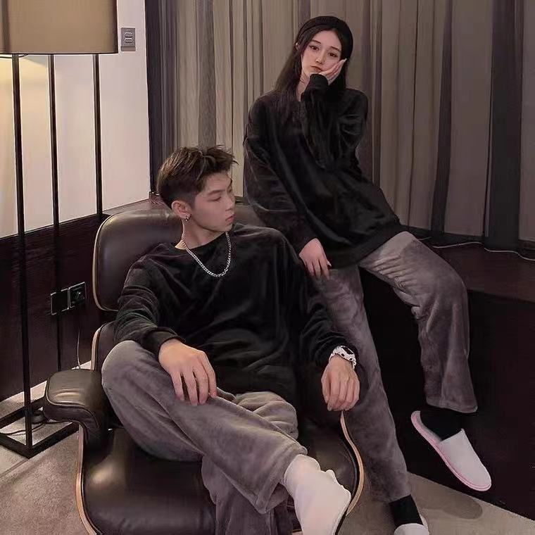 Loại cổ áo: Cổ tròn; Chi tiết Phong cách Quần áo: In ấn; Độ tuổi áp dụng: Thanh niên (18-25 tuổi); Chiều dài tay áo: Dài tay; Phong cách mặc nhà: Đơn giản; Giới tính áp dụng: Các cặp đôi; Độ dày: Dày và mỏng: Dày; Nội dung thành phần: 91% (Bao gồm) -95% (Bao gồm); Chất liệu chính vải: Polyester (Sợi Polyester); Tên thường gọi của vải: Flannel; Xuất xứ: Tỉnh Quảng Đông; Phân loại màu sắc: Áo đen + Quần xám (Nam), Áo đen + Quần xám (Nữ), Đôi cổ tròn dài Gấu lớn Kích thước: M, L, XL, 2XL