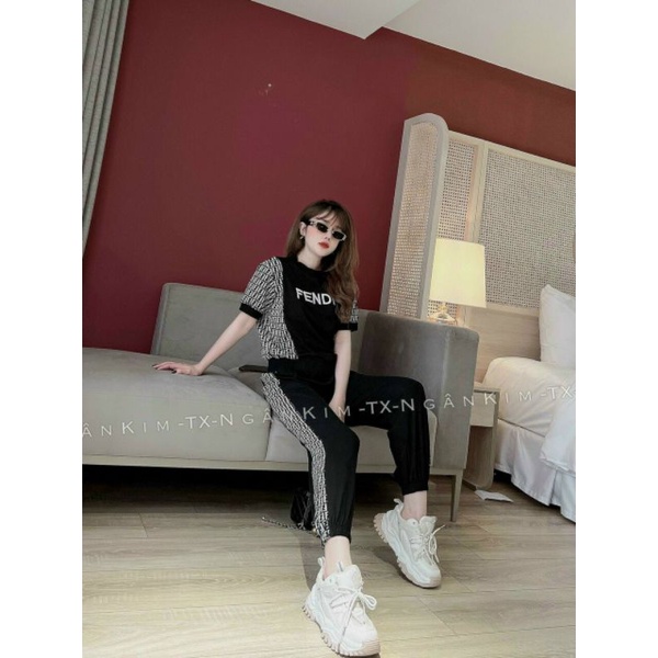 Bộ đồ thể thao nữ quần bo gấu áo phối họa tiết thêu logo sang trọng trẻ trung