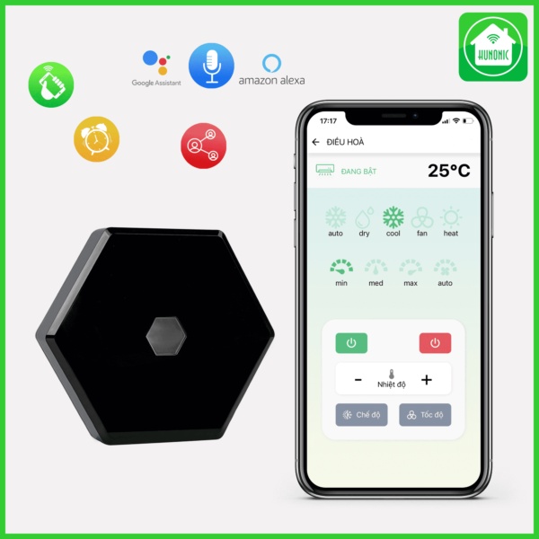 [ BH 12 THÁNG ] Điều khiển hồng ngoại thiết bị tivi, điều hoà, dàn âm thanh, đầu KTS, quạt… từ xa qua điện thoại | Hunonic IR Smart HÀNG VIỆT NAM - CHẤT LƯỢNG CAO! Bộ điều khiển hồng ngoại Hunonic IR Smart do Hunonic nghiên cứu và sản xuất tại Việt Nam có khả năng điều khiển mọi thiết bị hồng ngoại như tivi, điều hoà, dàn âm thanh, đầu KTS, quạt,... từ xa qua điện thoại. Một trong những thiết bị chủ đạo trong giải pháp điều khiển tivi, điều hoà,… từ xa. Bộ điều khiển hồng ngoại Hunonic IR Smart được thiết kế trên dây chuyền hiện đại, có 6 mặt hồng ngoại xếp thành hình lục giác đảm bảo lệnh phát đi được thiết bị tiếp nhận nhanh, chính xác. ***Cho phép người dùng: - Điều khiển các thiết bị hồng ngoại từ xa qua điện thoại chỉ cần có sóng Wifi, 3G, 4G. - Bên cạnh đó bạn cũng có thể điều chỉnh nhiệt độ, chế độ của điều hoà, bật/tắt tivi, chuyển kênh, tăng giảm âm lượng…dù bạn ở bất kỳ nơi đâu. - Hẹn giờ bật/ tắt hoàn toàn tự động cho các thiết bị điện như: tivi, điều hoà, đầu kỹ thuật số, quạt,... - Chia sẻ cho các thành viên trong gia đình cùng sử dụng thiết bị hoàn toàn miễn phí. - Cho phép tạo ngữ cảnh thông minh với các thiết bị thông minh khác, bật tắt các thiết bị chỉ với 1 chạm mà không gặp trở ngại gì. - Điều khiển từ xa qua điện thoại hoàn toàn độc lập, không cần bộ điều khiển trung tâm giúp tiết kiệm chi phí tối đa. - Nói không với đục phá tường, chỉ cần vị trí đặt có Wifi và nguồn điện là sử dụng được. - Thiết kế nhỏ gọn, phù hợp với mọi không gian sống - Điều khiển thiết bị hồng ngoại qua giọng nói nhờ Alexa và Google Asisstant - Có khả năng học và ghi nhớ lên đến 1000 lệnh từ nhiều remote của nhiều thiết bị khác nhau. Tương thích hầu hết các loại thiết bị hồng ngoại trên thị trường - Phần mềm tiếng Việt, giao diện thân thiện dành cho người Việt, sử dụng miễn phí trọn đời - Sever máy chủ đặt tại Việt Nam. Đường truyền ổn định. Tính bảo mật cao, không lo bị hack - Bảo hành lỗi 1 đổi 1 trong 12 tháng. Không nơi nào có chính sách này ngoài nhà thông minh Hunonic. THÔNG SỐ KỸ THUẬT: + Giao tiếp không dây chuẩn Wifi. + Kích thước : 80 x 70 x 17 mm + Phạm vi hồng ngoại: ≤8m hunonic_ir; ir_smart #điều_khiển_từ_xa #nhà_thông_minh #thiết_bị_điện_thông_minh #hunonic #điều_khiển_từ_xa_qua_điện_thoại #mô_hình_nhà_thông_minh #nhà_thông_minh_là_gì #công_tắc_wifi_hunonic #mô_hình_nhà_thông_minh #công_tắc_ điện_thông_minh #nhà_thông_minh_Việt_Nam #công_tắc_thông_minh_giá_rẻ #công_tắc_cảm_ứng_chạm #hẹn_giờ #công_tắc_hẹn_ giờ_ tự_ động #tuya #dieukhien #hongngoai #smartlife #rmmini3 #rmpro #broadlink #trunttamtuya #trungtamhongngoaituya #botrungtamtuya #tuya #thietbidieukhienhongngoai #điều_khiển_hồng_ngoại; #điều_khiển_hồng_ngoại_xiaomi #bộ_điều_khiển_hồng ngoại_broadlink_bestcon_rm4c_mini ĐÁNH GIÁ SẢN PHẨM