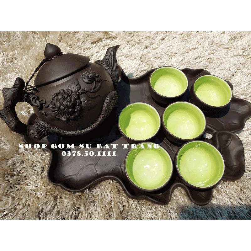 Bộ ấm trà bát tràng gốm tử sa khay lá sen nổi đẹp