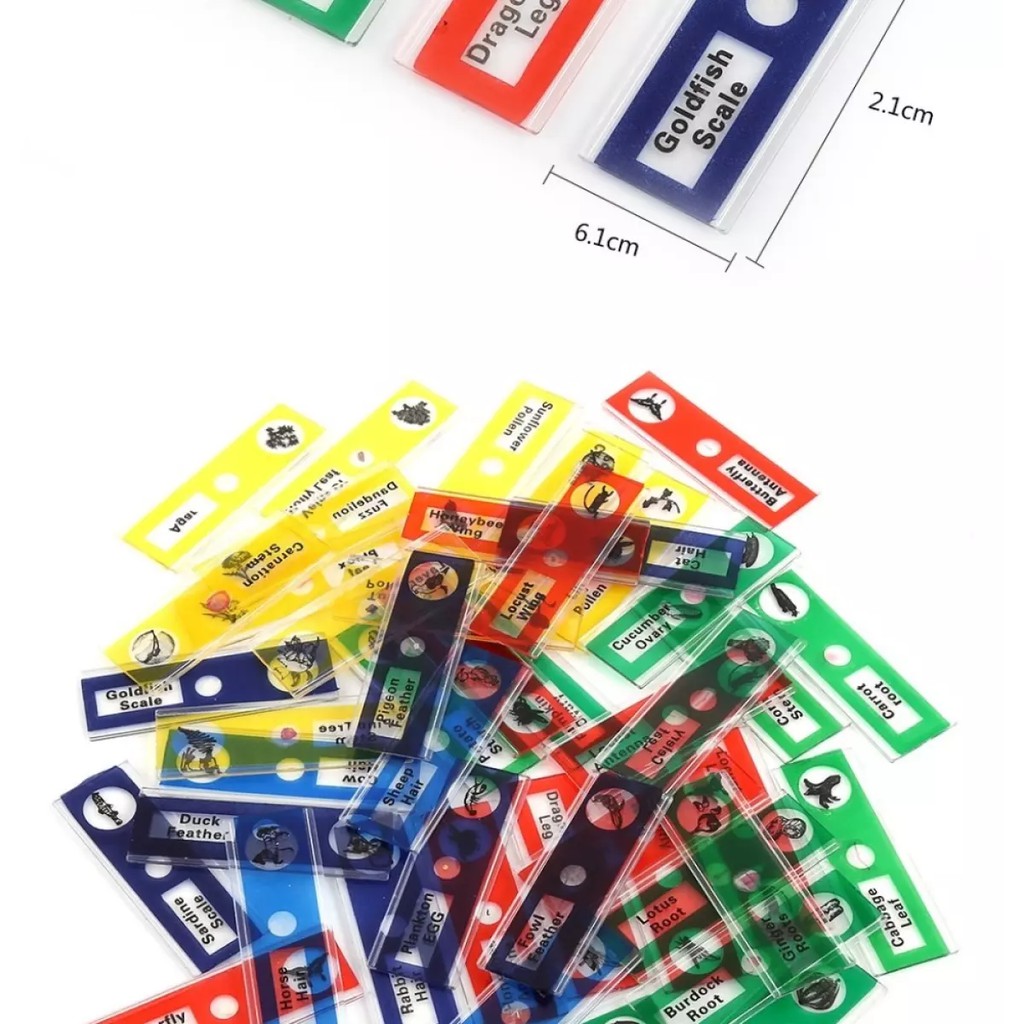 - Hộp tiêu bản sẵn cho kính hiển vi là gì ? Với việc nghiên cứu sinh học, sử dụng kính hiển vi, thông thường trẻ em sẽ được dạy và thực hành làm các mẫu tiêu bản để quan sát, từ đó nhận xét và đưa ra các đặc điểm của loài - Những tiêu bản sẵn có là những tiêu bản đã được làm sẵn và nhuộm màu để người dùng có thể dễ dàng quan sát ngay dưới kính hiển vi - 1 Bộ gồm 4 loại với 12 tiêu bản - Tiêu bản màu xanh lá cây và màu vàng là tiêu bản thực vật - Tiêu bản màu đỏ và xanh lam đậm là tiêu bản động vật và côn trùng